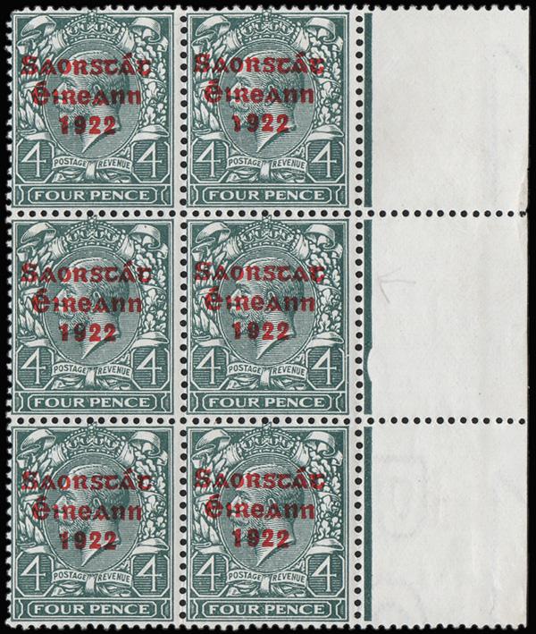 1922, Thom overprint, ½d green, accent inserted by hand, and 4d gray, accent omitted (Scott 44b, 50a), two examples of the first, one in a block of 9 (with 8 normal), the other in a block of 6, o.g. (varieties never hinged), Fine to Very Fine. SG 52b, 58a. Scott $460+. (Image)