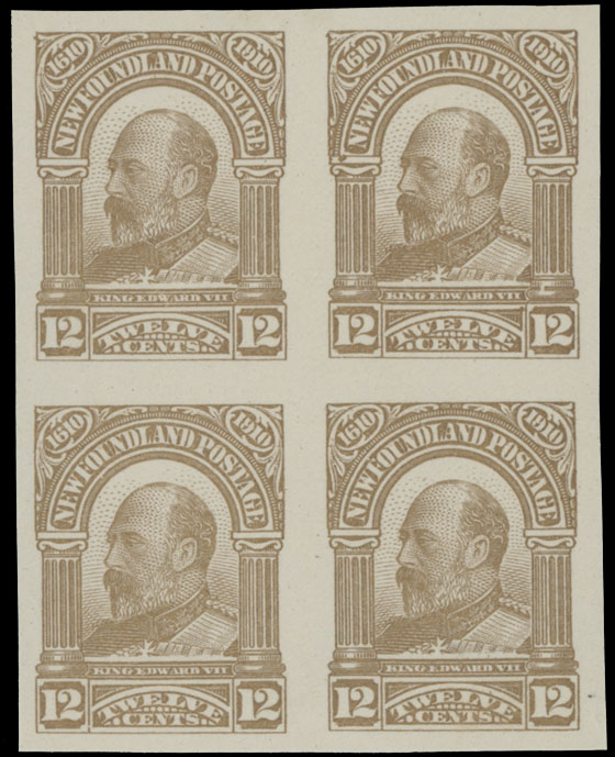 John Guy lithographed issue. 1910, King Edward VII, imperforate trail color proof of 12c in yellow brown, block of four printed o white paper without watermark, full OG, NH, VF and rare, NSSC 88c, C.v. US$1,200 as singles, Est. $600-$700 (Image)