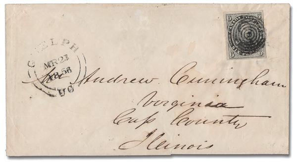 1855, Prince Albert, 6d slate gray, on wove paper, imperforate (Scott 5), ample to large margins (a little close, but well clear at the bottom), tied by a neat target cancel on a cover from Guelph, U.C. to Virginia, Ill. with a mostly clear Guelph split-ring datestamp, Mar 23, 1856; bottom flap torn and cosmetically refolded, Fine to Very Fine. Scott $1,400. (Image)
