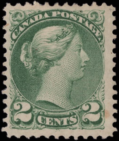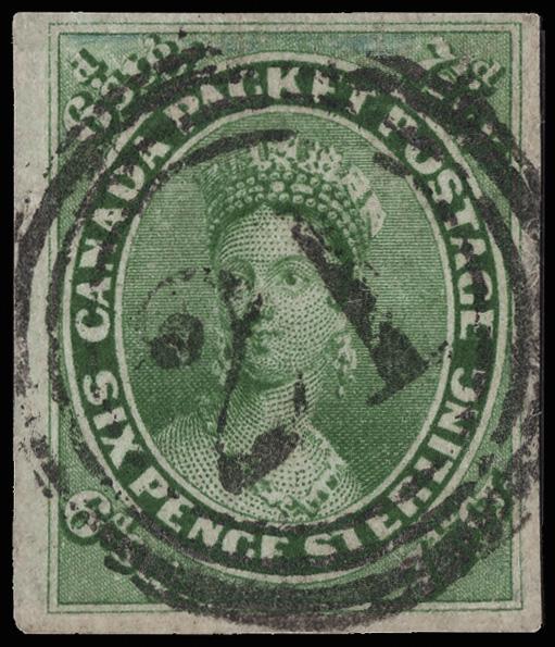 1857, Queen Victoria, 7½d green, imperforate (Scott 9), an outstanding used example: exceptionally fresh with a striking, "socked-on-the-nose" Montreal "21" 4-ring cancel; three ample to large margins, the fourth a bit close, but well clear, virtually Very Fine and quite striking, with 1955 P.F. & 1993 Greene Foundation certificates. Scott $3,250. (Image)