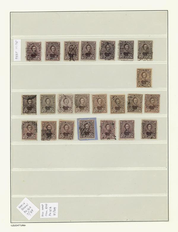 1859, Prince Albert, 10¢ red lilac, study/stock array (Scott 17), 46 examples of this popular issue, neatly arranged on two Lighthouse album stock pages; organized by perforation varieties (11¾ and 12), with solid range of shades from bright red violet to violet to browns, plus a nice mix of cancels; fresh and sound appearing, generally Fine to Very Fine, fully imaged online. Scott $6,440 as cheapest shade. (Image)