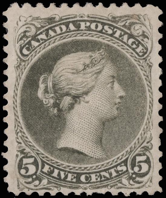 1875, Large Queen, 5¢ olive green, perf. 11½ (Scott 26), a most attractive mint single, o.g., lightly hinged, exceptionally fresh and reasonably well centered, Fine to Very Fine, A desirable, very scarce mint example., with a 2024 P.F. certificate. Scott $3,000. (Image)