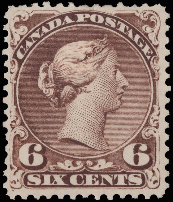 1868, Large Queen, 6¢ yellow brown (Scott 27a), o.g., paper hinge remnant, fresh, rich color; few "shortish" perfs at the top (not mentioned on the accompanying certificate), otherwise Fine to Very Fine, with 2025 P.F. certificate. Scott $2,250. (Image)