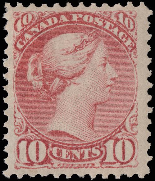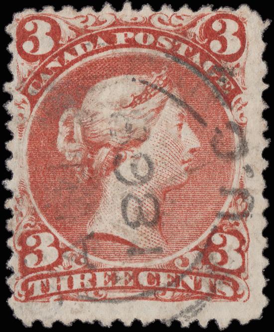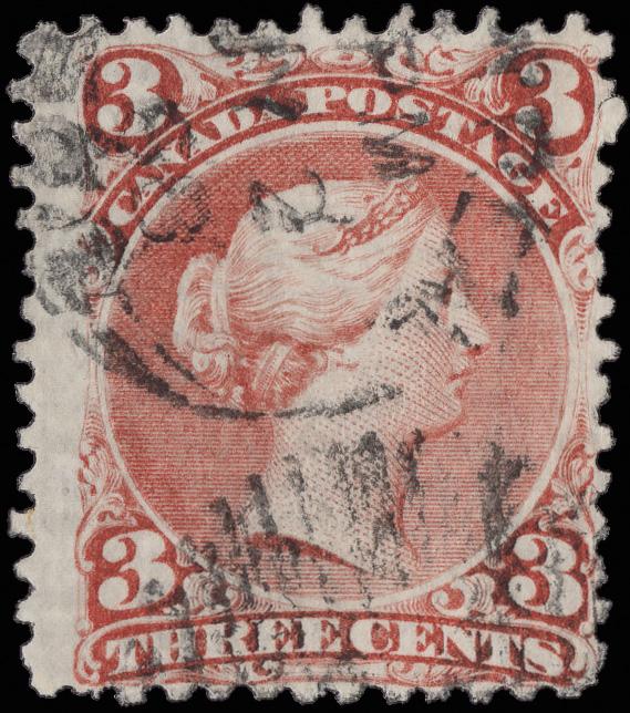 1868, Large Queen, 3¢ bright red, on laid paper (Scott 33), fresh color with a Montreal duplex handstamp, Jul 2, 1868, Fine. Scott $2,000. (Image)