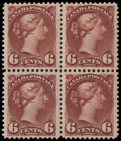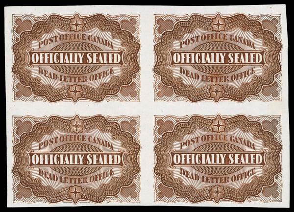 Official Seal, 1879, brown, plate proof on India (Scott OX1), block of 4, fresh and sound with ample to full margins all around, Very Fine. Unitrade O1P; C$2,400 as singles ($1,780). (Image)