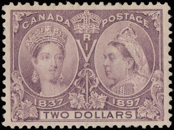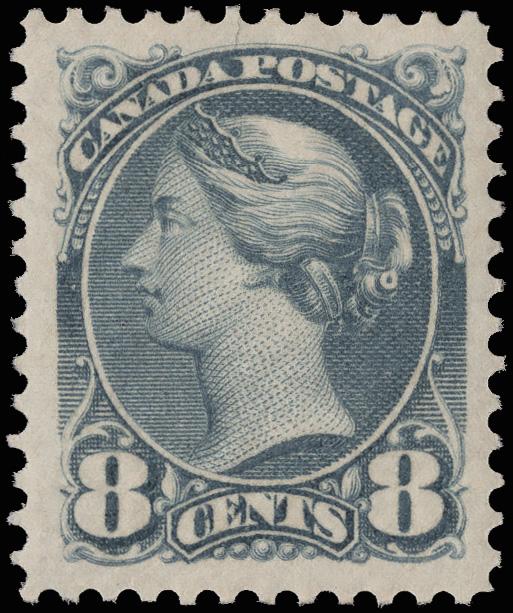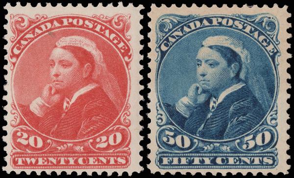 1899, Queen Victoria "Numeral", 5¢ blue, on bluish paper (Scott 79), a gorgeous top sheet margin pair with partial imprint plate no. 3, o.g., left stamp never hinged, right with a small hinge remnant, bright, fresh and beautifully centered with extra large margins and exceptional color and contrast, Extremely Fine and choice, with a 2011 Gratton certificate. Unitrade C$1,400+ ($1,040). Scott $750+. (Image)