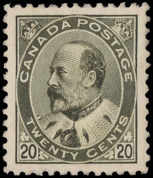 1903, King Edward VII, 20¢ olive green (Scott 94), an extraordinary mint single, o.g., lightly hinged, fresh and precisely centered within perfectly balanced margins, a Superb gem. Unitrade C$1,250 ($930). Scott $750. (Image)