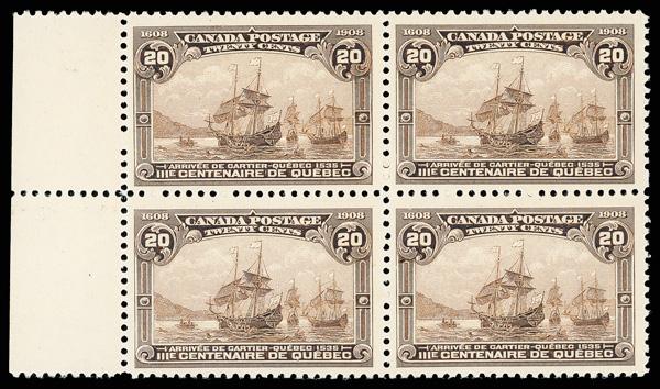 1908, 20¢ Quebec Tercentenary (Scott 103), left margin block of 4, o.g., never hinged, with beautiful detail on like-new fresh paper, Very Fine. Scott $2,500 as singles. (Image)