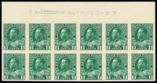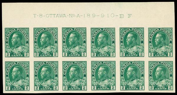 1924, King George V "Admiral", 2¢ green, imperf (Scott 137), top margin plate block of 12 with imprint, o.g., stamps never hinged, hinged in selvage only, in deep color on bright paper with full margins all around, Very Fine. Scott $840+. (Image)