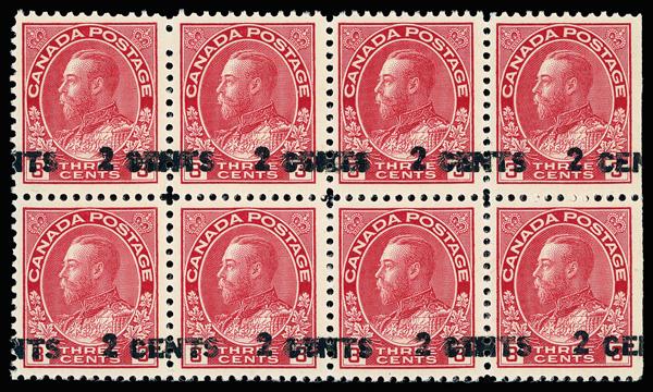 1926, King George V "Admiral", 2¢ on 3¢ carmine, surcharge dramatically shifted to right (Unitrade 139i), right margin horizontal block of 8, the basic stamps pristine with intense color and intact perforations, the surcharge shifted laterally by 50%; never hinged except positions 2-3 lightly hinged, Very Fine, a striking item. Scott 139 var. (Image)