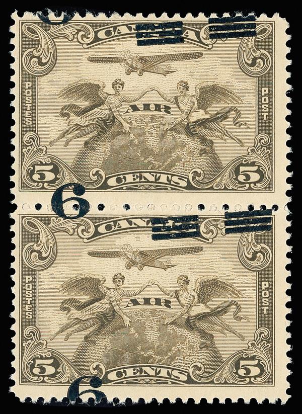 Airmail, 1932, 6¢ on 5¢ brown olive, dramatic surcharge shift (Unitrade C3ii), vertical pair, eye-catching error with surcharge shifted to left and skewed to top right; top stamp lightly hinged, bottom never hinged, Fine to Very Fine. Scott C3 var. (Image)