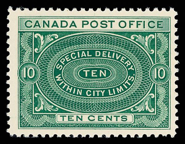 Special Delivery, 1898, 10¢ blue green (Scott E1), o.g., never hinged, Post Office fresh with crisp color on bright white paper, Very Fine. Scott $675. (Image)