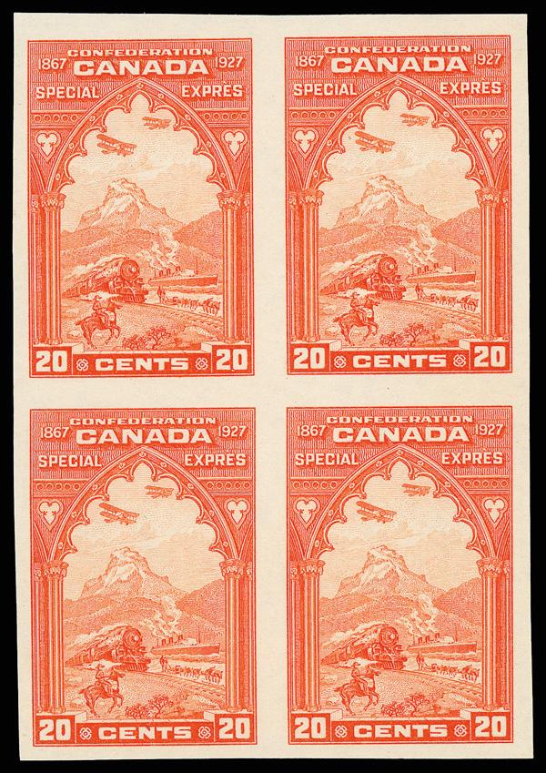 Special Delivery, 1927, Confederation, 20¢ orange, imperforate (Scott E3a), o.g., never hinged, block of four yielding two pairs, all Post Office fresh with vibrant color and balanced margins, Very Fine. Scott $700 as two pairs. (Image)