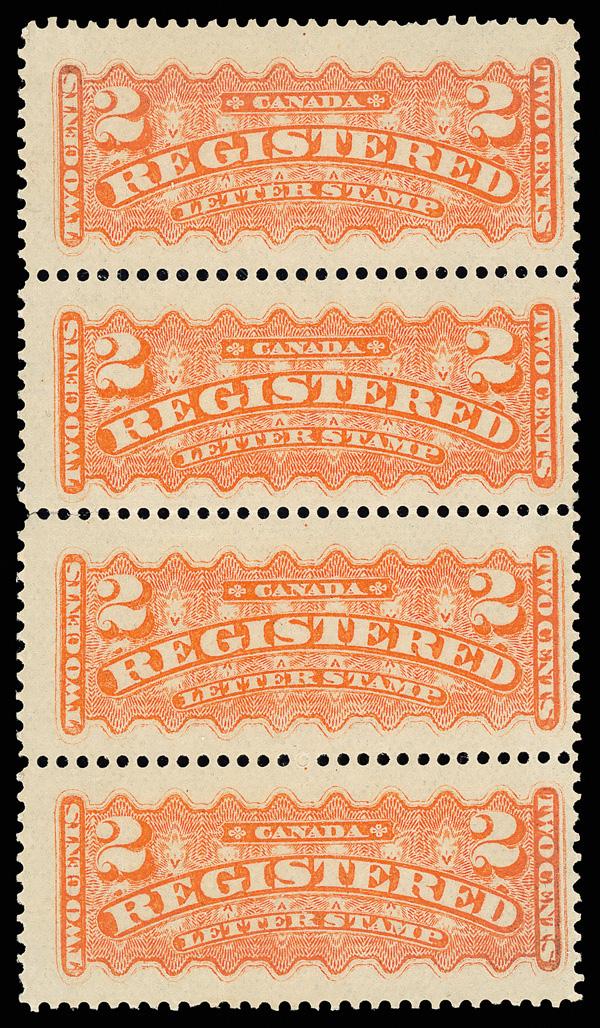 Registry, 1875, 2¢ orange (Scott F1), vertical strip of 4, o.g., never hinged, bright, clean color on fresh paper; couple separations at center, Fine to Very Fine. Scott $1,320 as singles. (Image)