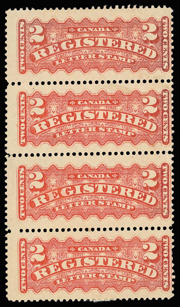 Registry, 1875, 2¢ vermilion (Scott F1a), vertical strip of 4, with clean detail; top and bottom stamps hinged, two middle never hinged; diagonal bend position 2, Fine to Very Fine. Scott $1,470. (Image)