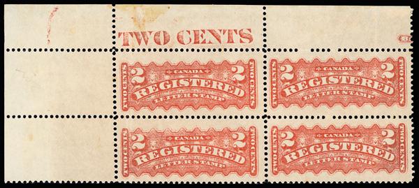 Registry, 1875, 2¢ vermilion (Scott F1a), top left block of 4 with value imprint, pretty positional with full selvage, the stamps well centered, position 4 never hinged; top right stamp disturbed o.g., positions 2 & 3 hinged, the lower pair with natural gum crease, Very Fine appearance. Scott $1,105 as singles. (Image)