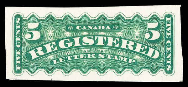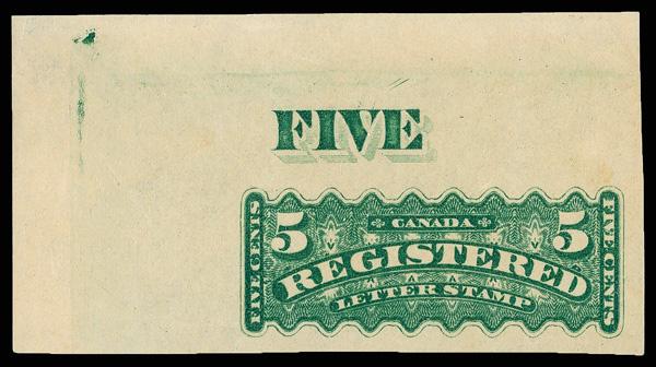 Registry, 1875, 5¢ dark green (Scott F2P), Post Office fresh on bright white, Very Fine. Unitrade C$1,000 ($740). (Image)