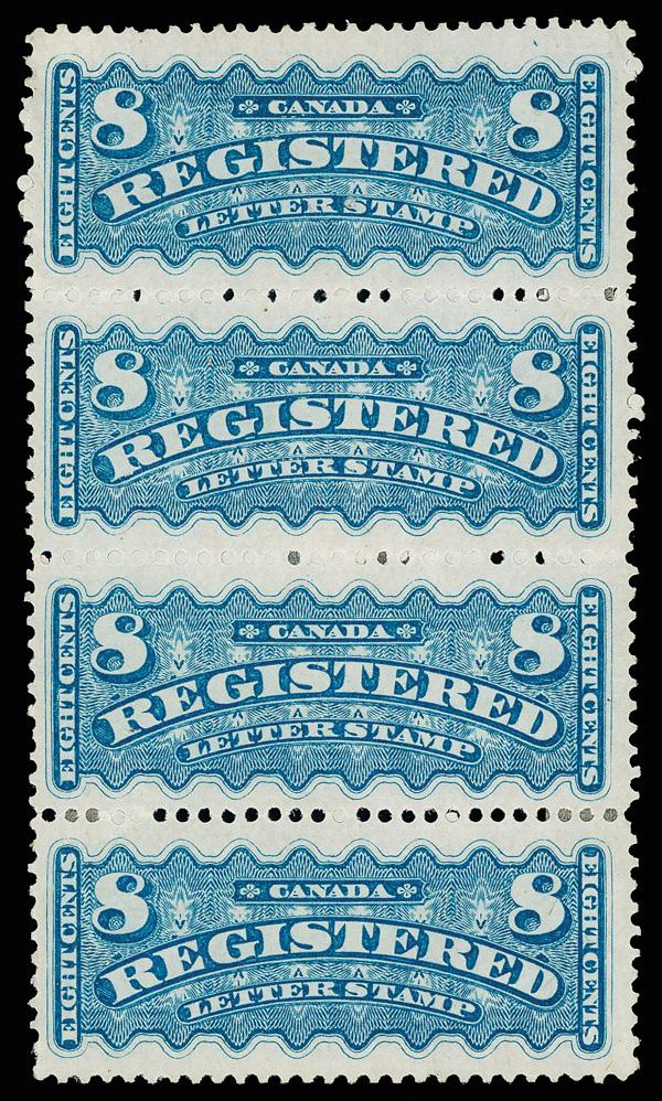 Registry, 1876, 8¢ dull blue (Scott F3), vertical strip of 4, unused without gum, stellar multiple with crisp impression on immaculate paper, Very Fine. Scott $2,700 as o.g. singles. (Image)