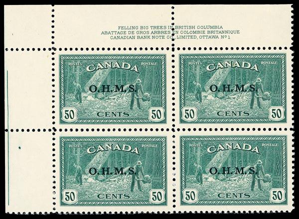 Official, 1949, 50¢ Lumbering, "O.H.M.S." overprint (Scott O9), top left plate number 1 block of 4 with imprint, o.g., never hinged, Post Office fresh and sound with outstanding color and clarity, Very Fine. Scott $1,750. (Image)