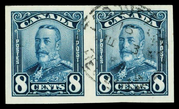 1928, King George V "Scroll", 8¢ blue, imperf. pair (Scott 154a), Extremely Fine, estimated 250 pairs issued, not priced used.(Image)