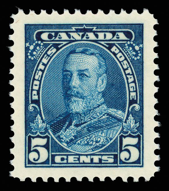 1935, King George V, 5¢ blue (Scott 221), Spectacular rich tone, o.g., never hinged, with 2024 P.S.E. certificate graded GEM 100. SMQ Gem 100; $300. (Image)