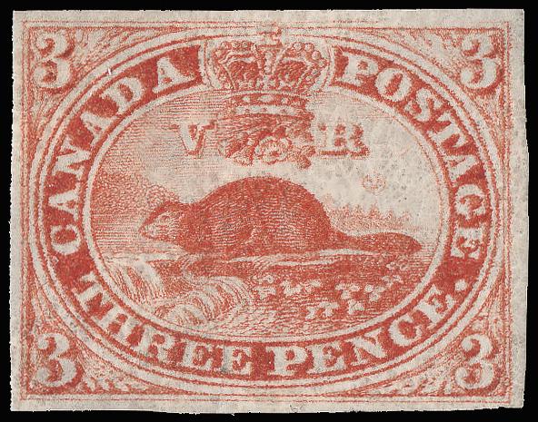 1852, Beaver, 3d orange red, on thin oily wove paper, imperforate (Unitrade 4iv), o.g., fresh and attractive with four nice margins; very faint vertical crease, Very Fine appearance, with a 2019 P.S.E. certificate. Scott 4 var. Unitrade C$2,500 for Very Fine ($1,860). (Image)
