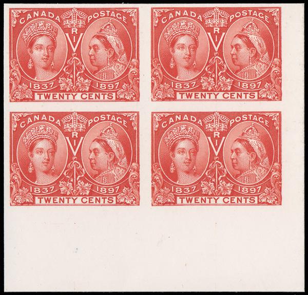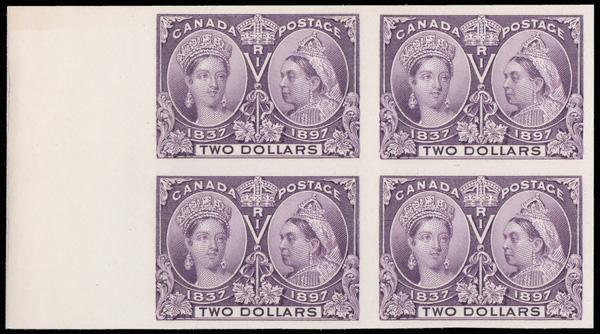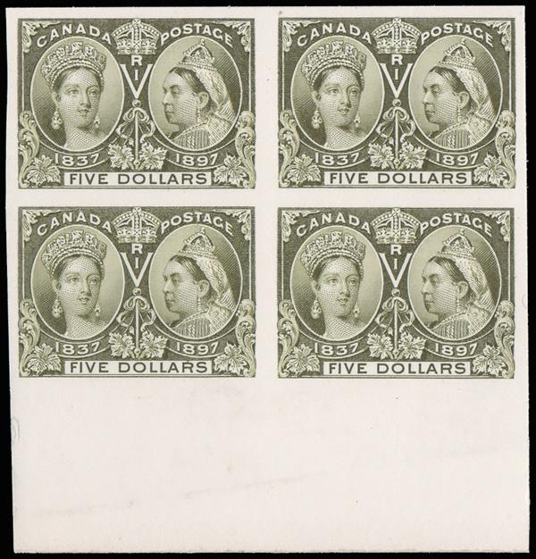 1897, Queen Victoria Jubilee, $5 olive green, plate proof on card (Scott 65), a choice bottom sheet margin block of 4, wonderfully fresh with large margins and exceptional color, Extremely Fine. Only 800 were produced. Unitrade C$3,200 as singles ($2,380). (Image)