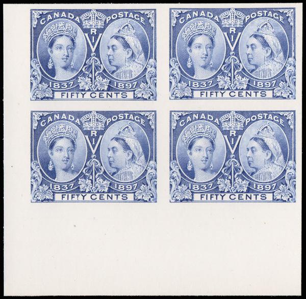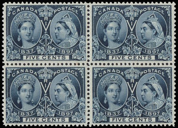 1897, Queen Victoria Jubilee, 5¢ deep blue (Scott 54), a choice, exceptionally well centered block of 4, o.g., never hinged, Very Fine to Extremely Fine, with a 2018 P.S.E. certificate graded VF-XF 85 . SMQ VF-XF 85; $920 as singles. Scott $800 as singles. (Image)