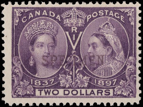 1897, Queen Victoria Jubilee, $2 dark purple (Scott 62S), o.g., never hinged, exceptionally fresh with fabulous color, Fine to Very Fine. Unitrade C$800 for Fine ($590). (Image)