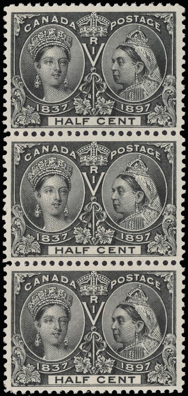 1897, Queen Victoria Jubilee, ½¢ black (Scott 50), a fresh, nicely centered strip of 3, o.g., never hinged, Very Fine, with a 2019 Greene Foundation certificate. Scott $825 as singles. (Image)