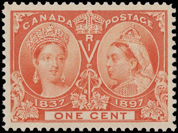 1897, Queen Victoria Jubilee, 1¢ orange (Scott 51), a fabulous mint single, o.g., never hinged, fresh and mathematically centered with spectacular color, Extremely Fine to Superb, with a 2006 P.F. certificate graded XF-S 95. Unitrade C$120 ($90). SMQ XF-S 95; $200. Scott $75. (Image)