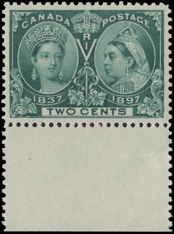 1897, Queen Victoria Jubilee, 2¢ green (Scott 52), a choice bottom sheet margin single, o.g., never hinged, bright, fresh and perfectly centered, Extremely Fine to Superb, with a 2025 P.S.E. certificate graded XF-SUP 95. Unitrade C$150 ($110). SMQ XF-SUP 95; $275. Scott $93. (Image)