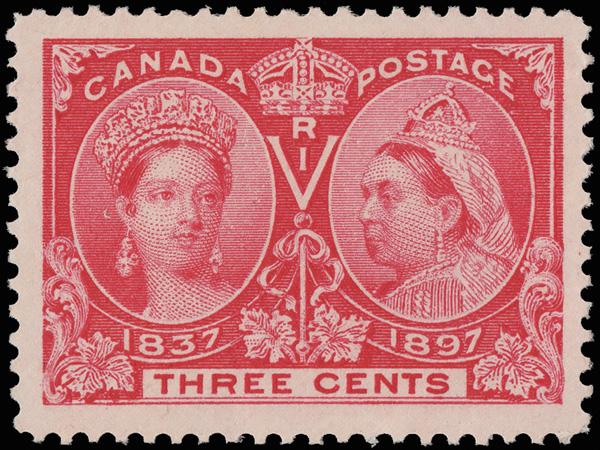 1897, Queen Victoria Jubilee, 3¢ bright rose (Scott 53), a remarkable Jumbo, o.g., never hinged, with 2018 C.P.E.S. certificate graded "95J". Unitrade C$120 ($90). SMQ XF-SUP 95J; $175 for a normal XF-Sup 95. Scott $75. (Image)