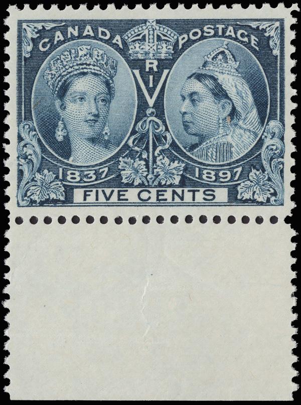 1897, Queen Victoria Jubilee, 5¢ deep blue (Scott 54), a pristine bottom sheet margin single, o.g., never hinged, post office fresh and virtually perfectly centered, Extremely Fine, with a 2019 P.S.E. certificate graded XF 90. SMQ XF 90; $300. Scott $200. (Image)