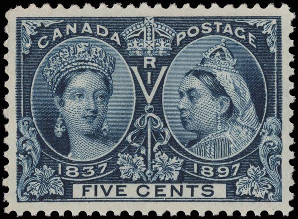 1897, Queen Victoria Jubilee, 5¢ deep blue (Scott 54), o.g., never hinged, fresh and beautifully centered, Very Fine to Extremely Fine, with a 2019 P.S.E. certificate graded VF-XF 85. SMQ VF-XF 85; $230. Scott $200. (Image)