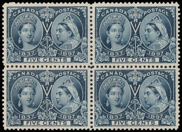 1897, Queen Victoria Jubilee, 5¢ deep blue (Scott 54), a choice, exceptionally well centered block of 4, o.g., never hinged, Very Fine, with a 2020 P.S.E. certificate graded VF 80. SMQ VF 80; $720 as singles. Scott $800 as singles. (Image)