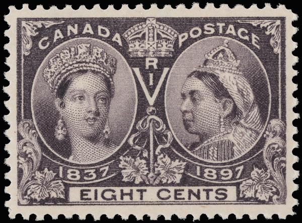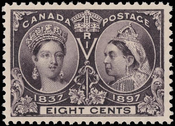 1897, Queen Victoria Jubilee, 8¢ dark violet (Scott 56), an exceptional mint example, o.g., never hinged, post office fresh and mathematically centered, Extremely Fine, with 2020 P.S.E. & 2019 Greene Foundation certificates, the former graded XF 90. Unitrade C$550 ($410). SMQ XF 90; $550. Scott $300. (Image)