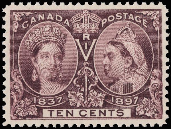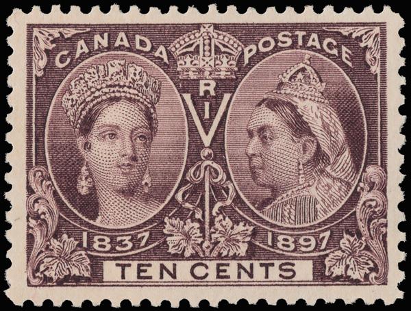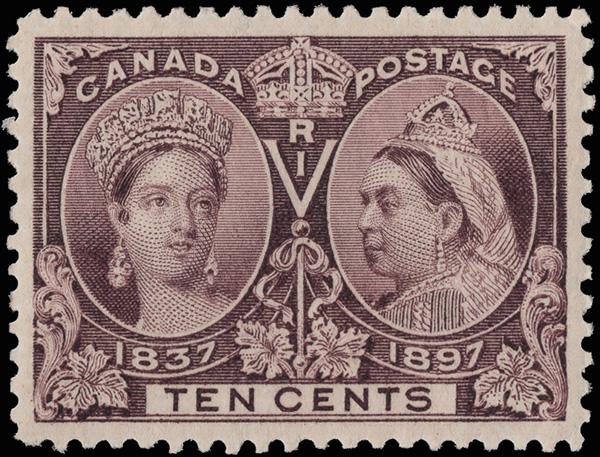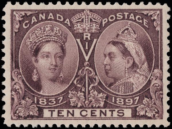 1897, Queen Victoria Jubilee, 10¢ brown violet (Scott 57), o.g., never hinged, bright, fresh and virtually perfectly centered, Extremely Fine, with a 2020 Greene Foundation certificate. Unitrade C$750 ($560). Scott $450. (Image)