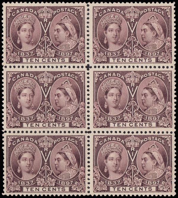 1897, Queen Victoria Jubilee, 10¢ brown violet (Scott 57), a fresh, nicely centered mint block of 6, o.g., never hinged; small natural paper wrinkle affecting the two top stamp, vertical perfs a little weak, Fine to Very Fine. Scott $2,700 as singles. (Image)