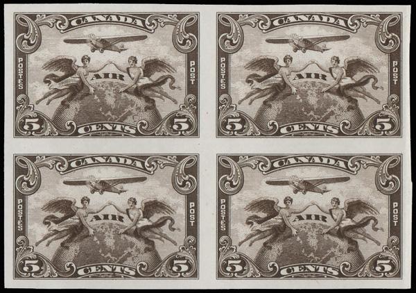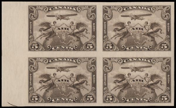 Airmail, 1928, 5¢ brown olive, imperf (Scott C1a), left sheet margin block of 4 with split arrow at the lower left, o.g., very lightly hinged at the top only, large balanced margins, Extremely Fine to Superb, with a 2019 P.S.E. certificate graded VF-XF 85. Unitrade C$875 ($650). Scott $613. (Image)