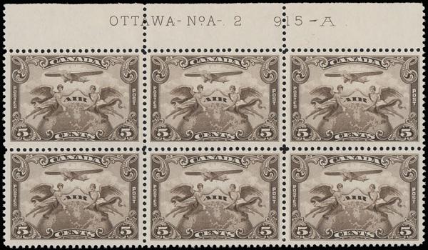Airmail, 1928, 5¢ brown olive (Scott C1), top Plate No. 2 block of 6, the upper right stamp being the "swollen breast" variety, o.g., never hinged, fresh and nicely centered, Very Fine, with a 2019 P.S.E. certificate. Unitrade C$500 ($370). Scott $350. (Image)