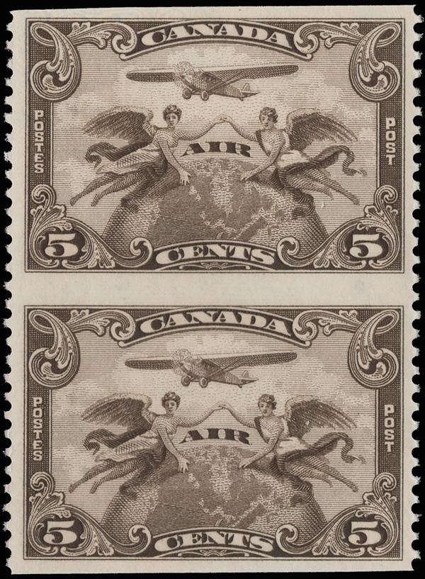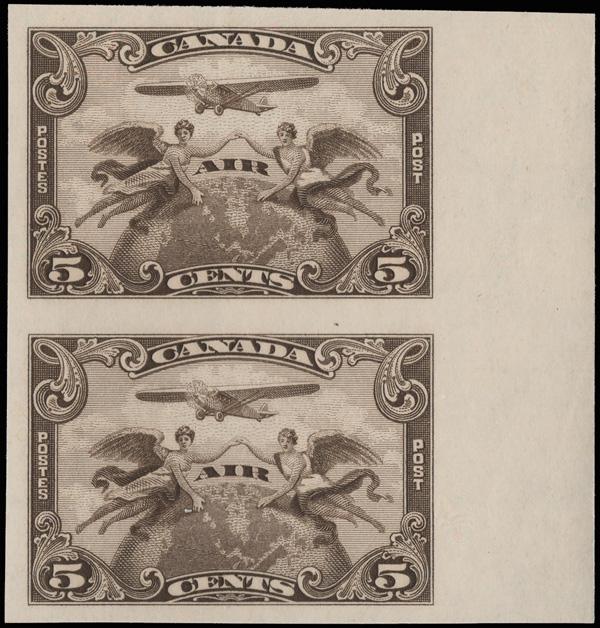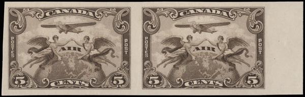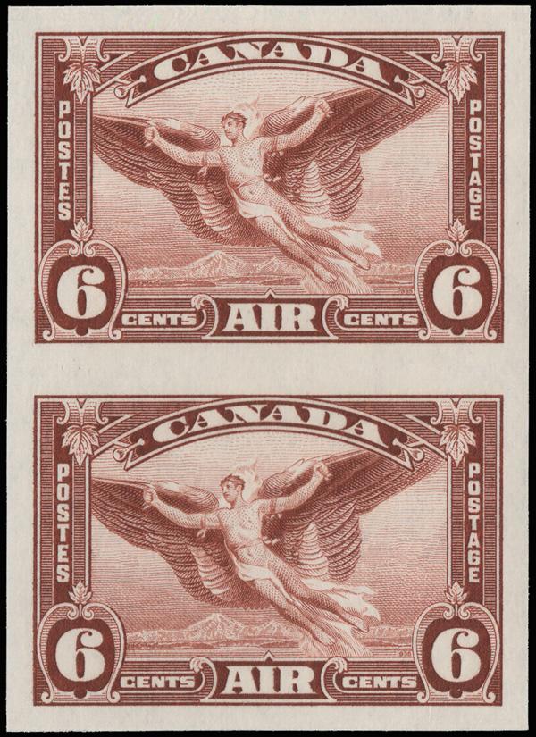 Airmail, 1935, 6¢ red brown, imperf (Scott C5b), a choice vertical pair, o.g., never hinged, exceptionally fresh with ample, well balanced margins, Very Fine to Extremely Fine. No more than 125 pairs possible, with a 2020 P.S.E. certificate graded VF-XF 85. Unitrade C$1,200 ($890). Scott $825. (Image)