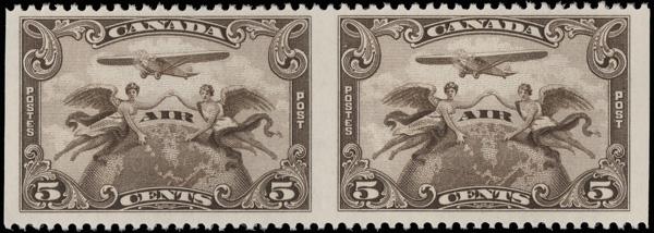 Airmail, 1928, 5¢ brown olive, horizontal pair, imperf. vertically (Scott C1b), o.g., never hinged, fresh and nicely centered, Fine to Very Fine, with a 2019 P.S.E. certificate. Unitrade C$525 ($390). Scott $368. (Image)