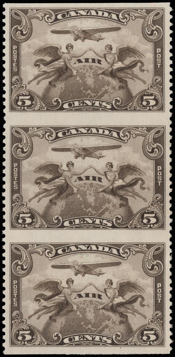 Airmail, 1928, 5¢ brown olive, imperf. horizontally (Scott C1c), a pretty vertical strip of 3, o.g., never hinged, fresh and well centered, Very Fine, with a 2019 P.S.E. certificate. Unitrade C$525+ ($390). Scott $368+. (Image)