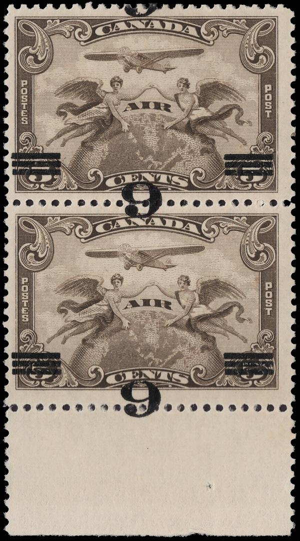 Airmail, 1932, 6¢ on 5¢ brown olive, surcharge inverted (Scott C3a), a striking bottom sheet margin vertical pair, o.g., bottom stamp never hinged, nicely centered, Very Fine, with a 2020 P.S.E. certificate. Unitrade C$750 as singles ($560). Scott $525 as singles. (Image)