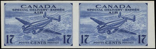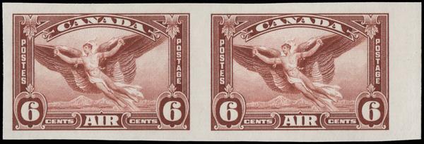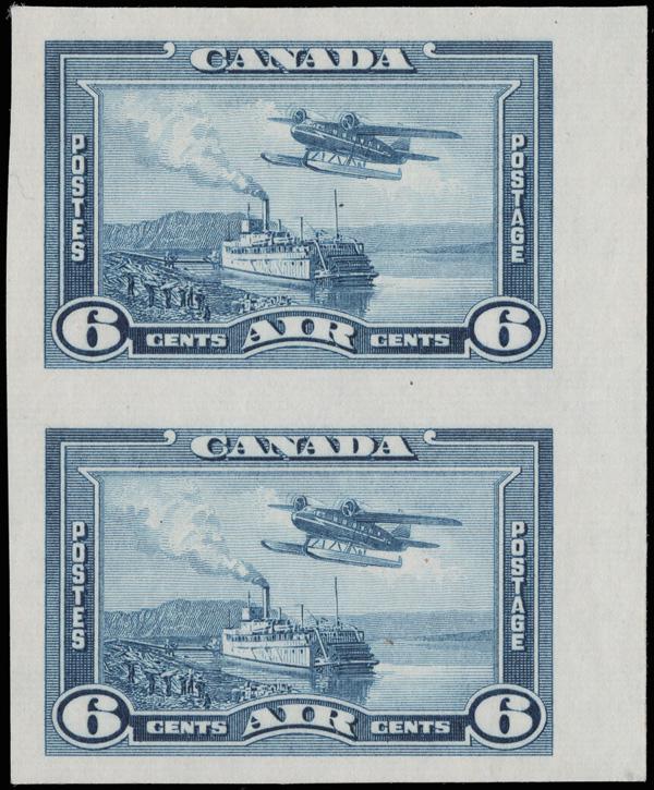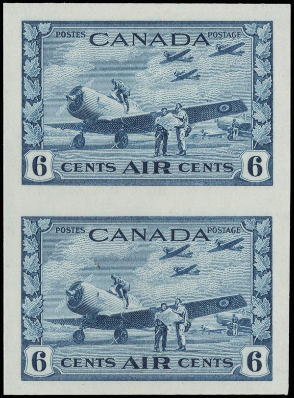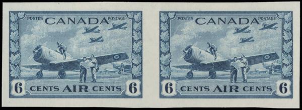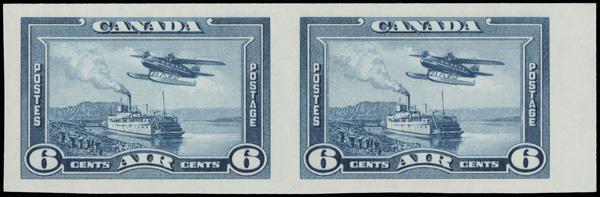 Airmail, 1938, 6¢ blue, imperf. pair (Scott C6a), o.g., never hinged, incredibly fresh with generous, beautifully balanced margins, Extremely Fine. Only 75 pairs were available, with a 2020 P.S.E. certificate graded XF 90. Unitrade C$1,200 ($890). Scott $850. (Image)