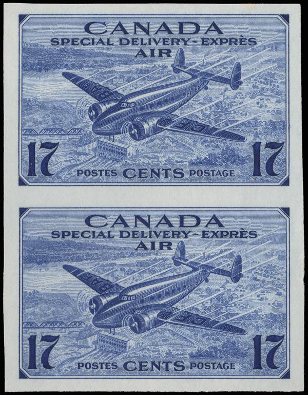 Airmail, 1942, 6¢ deep blue, imperf (Scott C7a), a magnificent vertical pair, o.g., never hinged, post office fresh with generous, beautifully balanced margins, Extremely Fine to Superb. Only 50 pairs recorded, with a 2020 P.S.E. certificate graded XF-SUP 95. Unitrade C$1,200 ($890). Scott $850. (Image)