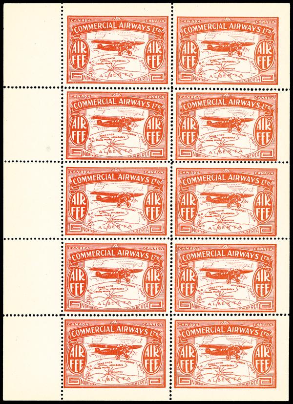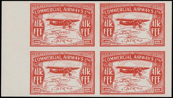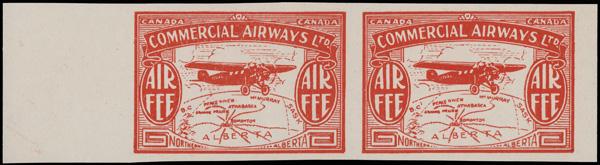 Commercial Airways Ltd. 1930 (10¢) orange, imperf (Scott CL50), a pretty left sheet margin horizontal pair, o.g., never hinged, bright, fresh and large-margined, Extremely Fine to Superb, with a 2018 P.S.E. certificate graded XF-SUP 95. Unitrade C$375 ($280). Scott $225. (Image)