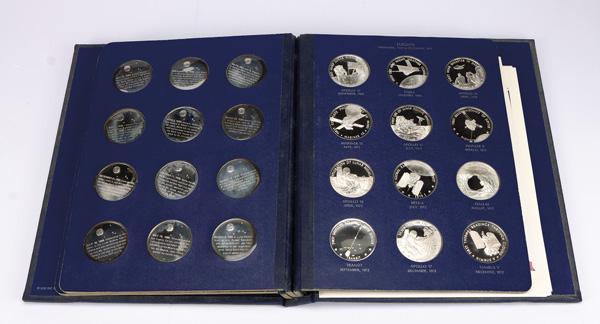 America in Space Silver Bullion Franklin Mint Set of 36 Proof Coins mounted in a Franklin Mint Binder, 1973, Lot of 36 Sterling silver coins, each commemorating different landmark events in space travel, each coin is 0.88 = 31.68 Troy Ounces, attractive set of coins (36 coins). Shipping charges apply - weight 5 lbs. (Image)