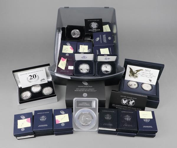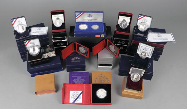 U.S. and Canadian Silver Commemorative and Issued coins, 1970s to 2020s., lot of over 40 Silver content commemorative or issued uncirculated or proof coins; OGP (40+). Shipping charges apply - weight 15 lbs. (Image)